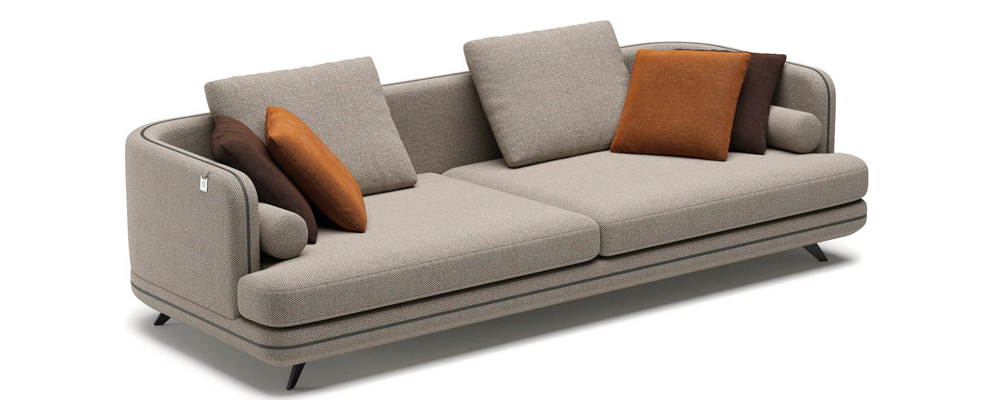 Сучасний диван A128 із м'якими формами, низькою глибокою посадкою на чорних металевих ногах. З декоративними елементами оздоблення по всьому периметру царги, спинки та підлокітників. Комплектується двома декоративними валиками та двома спиновими подушками для комфортного відпочинку.