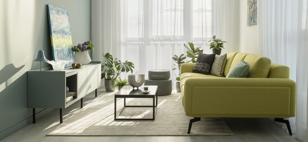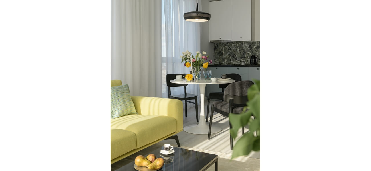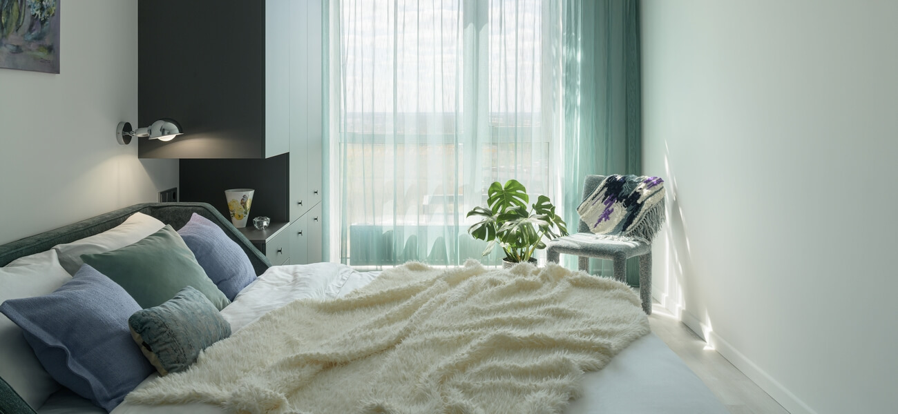 Зелений зручний диван збирає всю родину та друзів. В основній спальні вдало спланували місце для туалетного столику. Затишна гостьова кімната наповнення всім необхідним, є навіть, крісло та куточок для читання чи споглядання з вікна на воду.